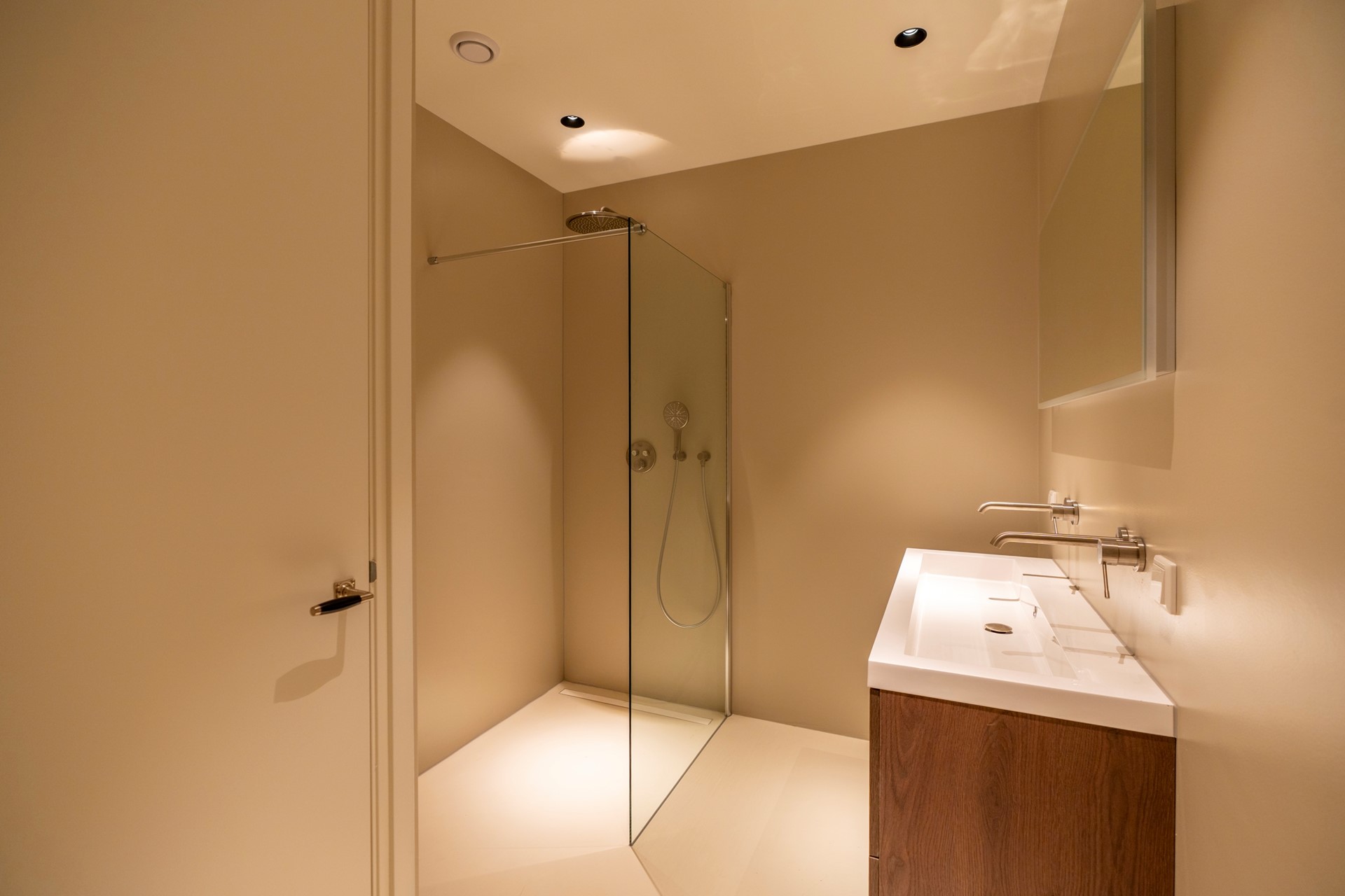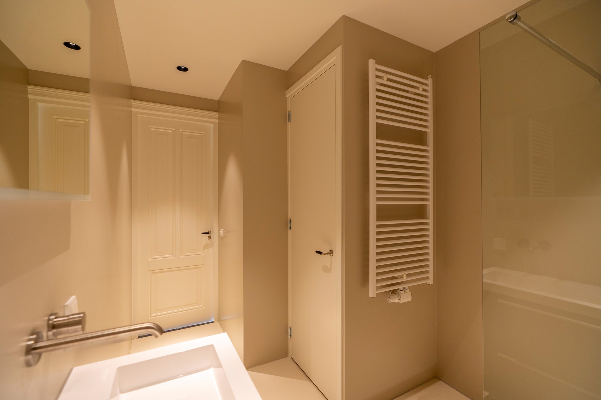 De smaakvolle badkamer is modern afgewerkt en voorzien van een inloopdouche, wastafelmeubel, handdoekradiator en wederom hoogwaardige materialen. Het separate toilet met fonteintje is in dezelfde stijl uitgevoerd.