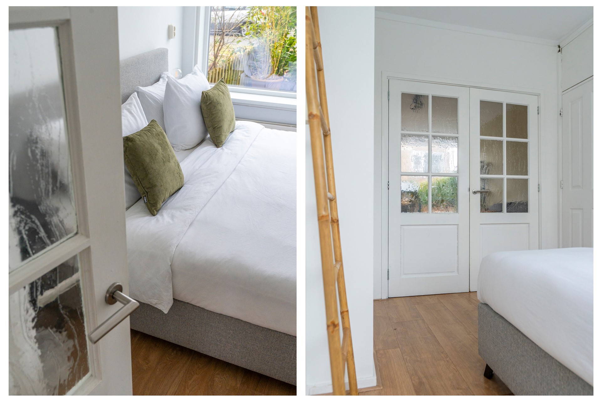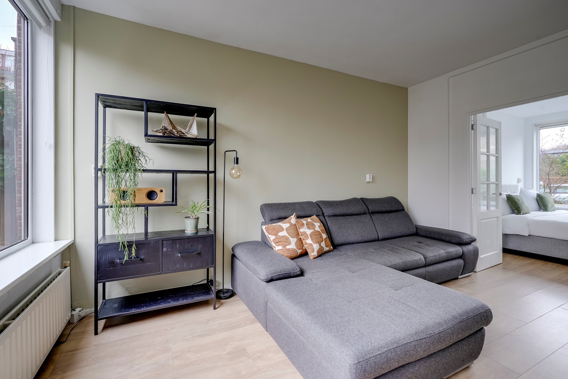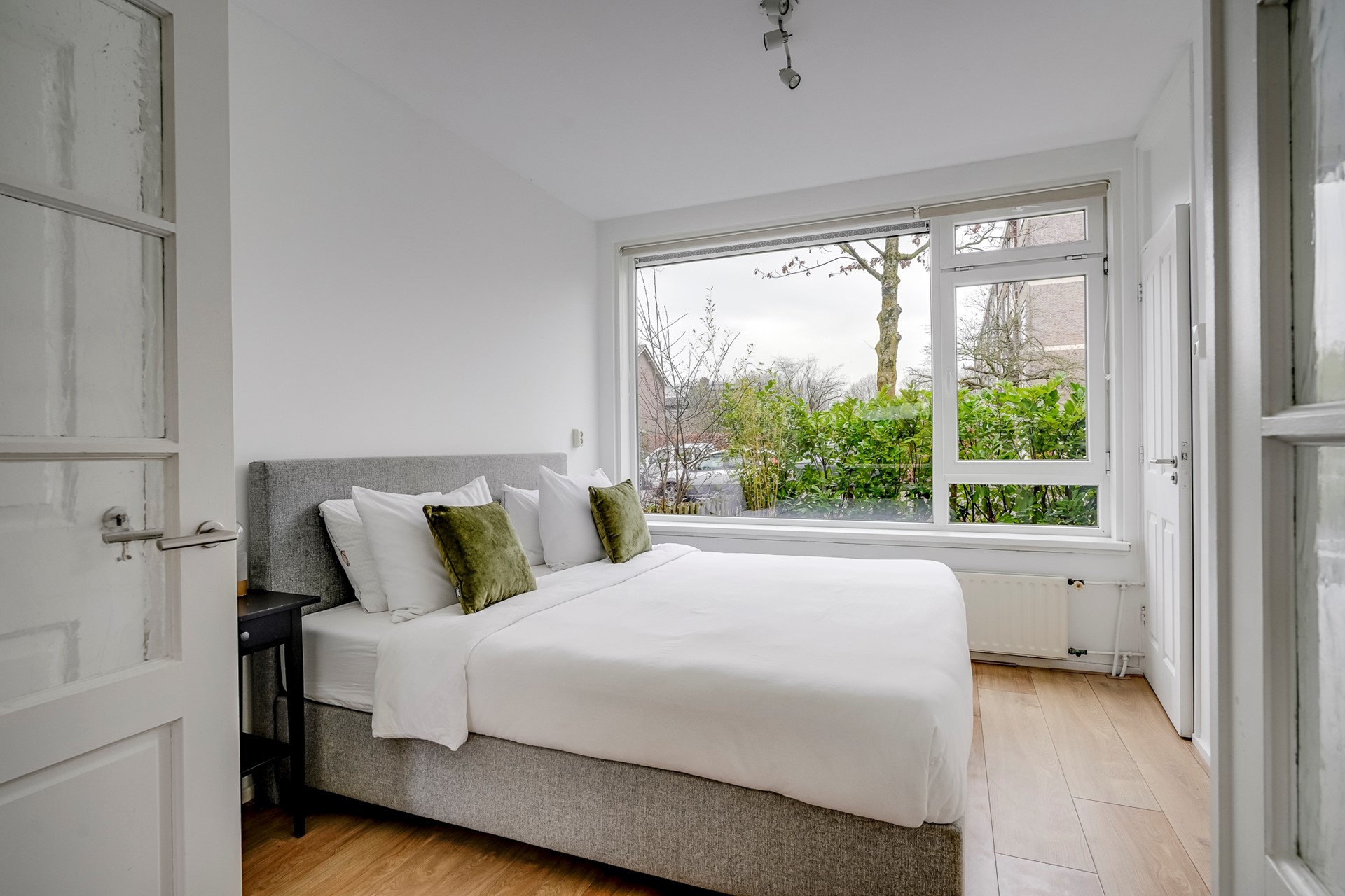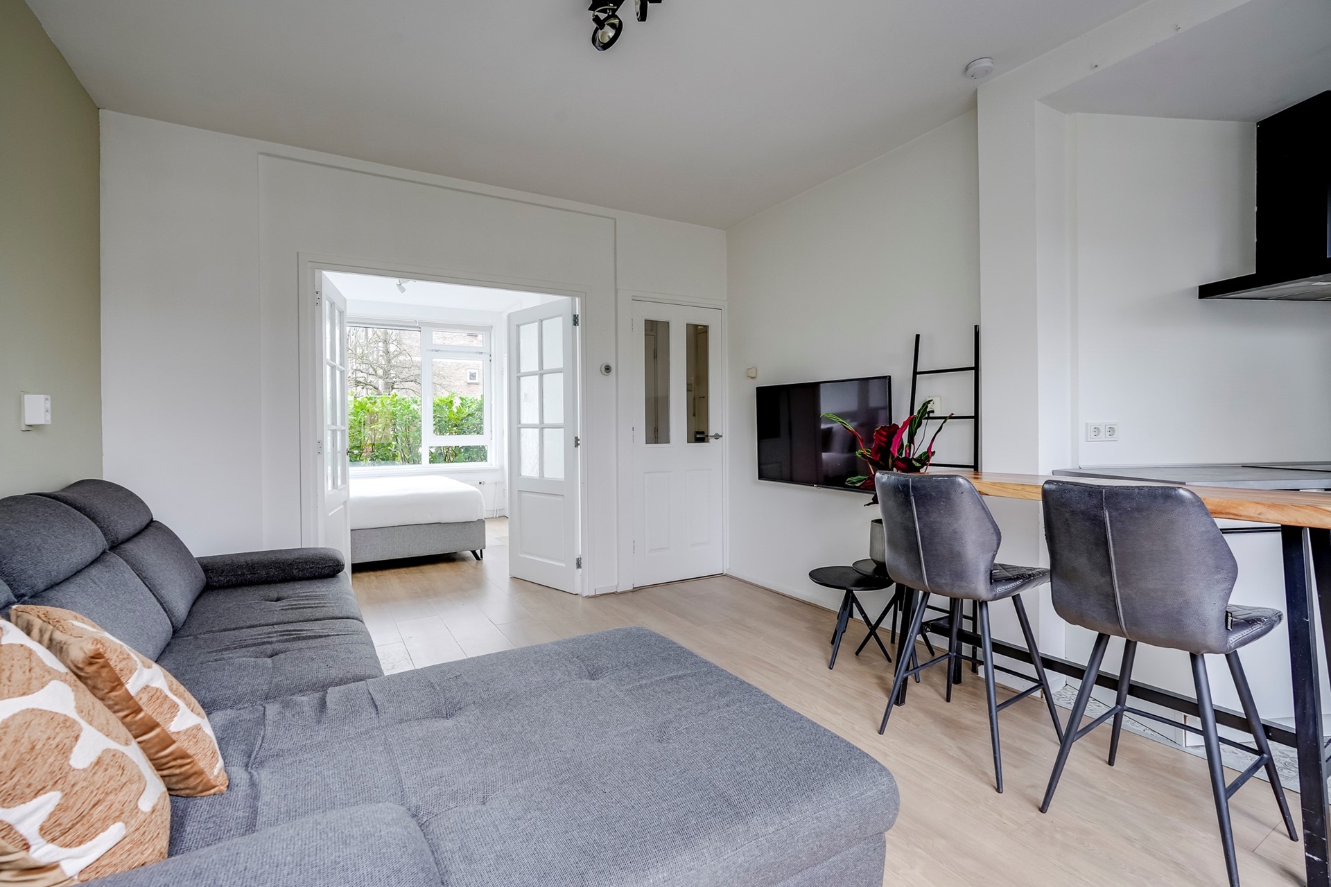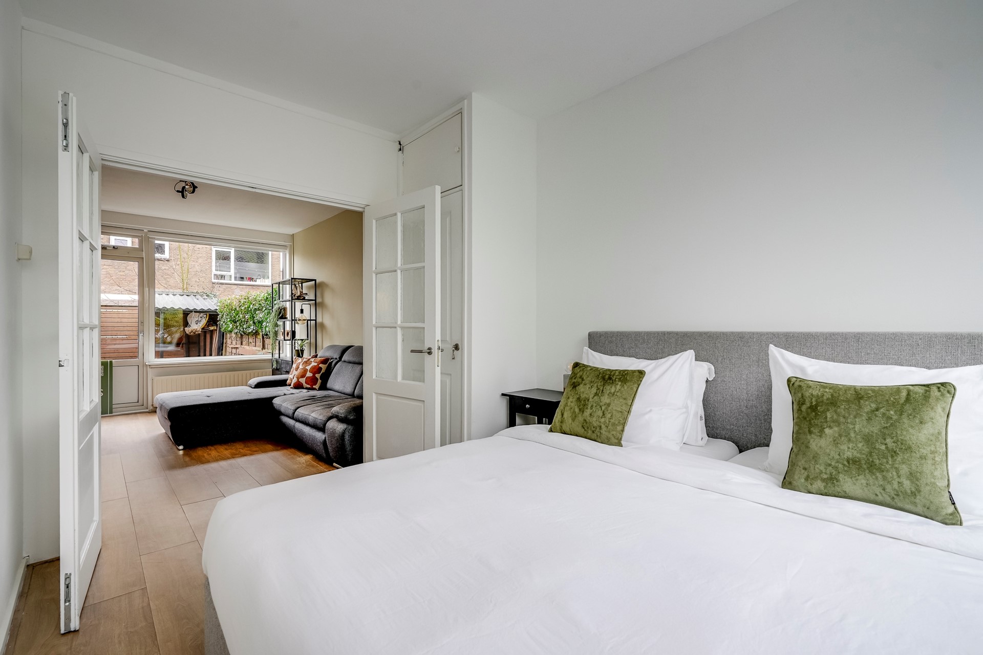 Door de openslaande deuren vanuit de woonkamer bereik je de slaapkamer. Ook hier zorgen grote ramen voor veel daglicht. De vaste kast biedt handige extra opbergruimte, iets wat in een starterswoning altijd welkom is. De moderne badkamer is recent gerenoveerd en uitgerust met een inloopdouche met glazen wand, een strak wastafelmeubel, handradiator en een raam voor natuurlijke ventilatie.