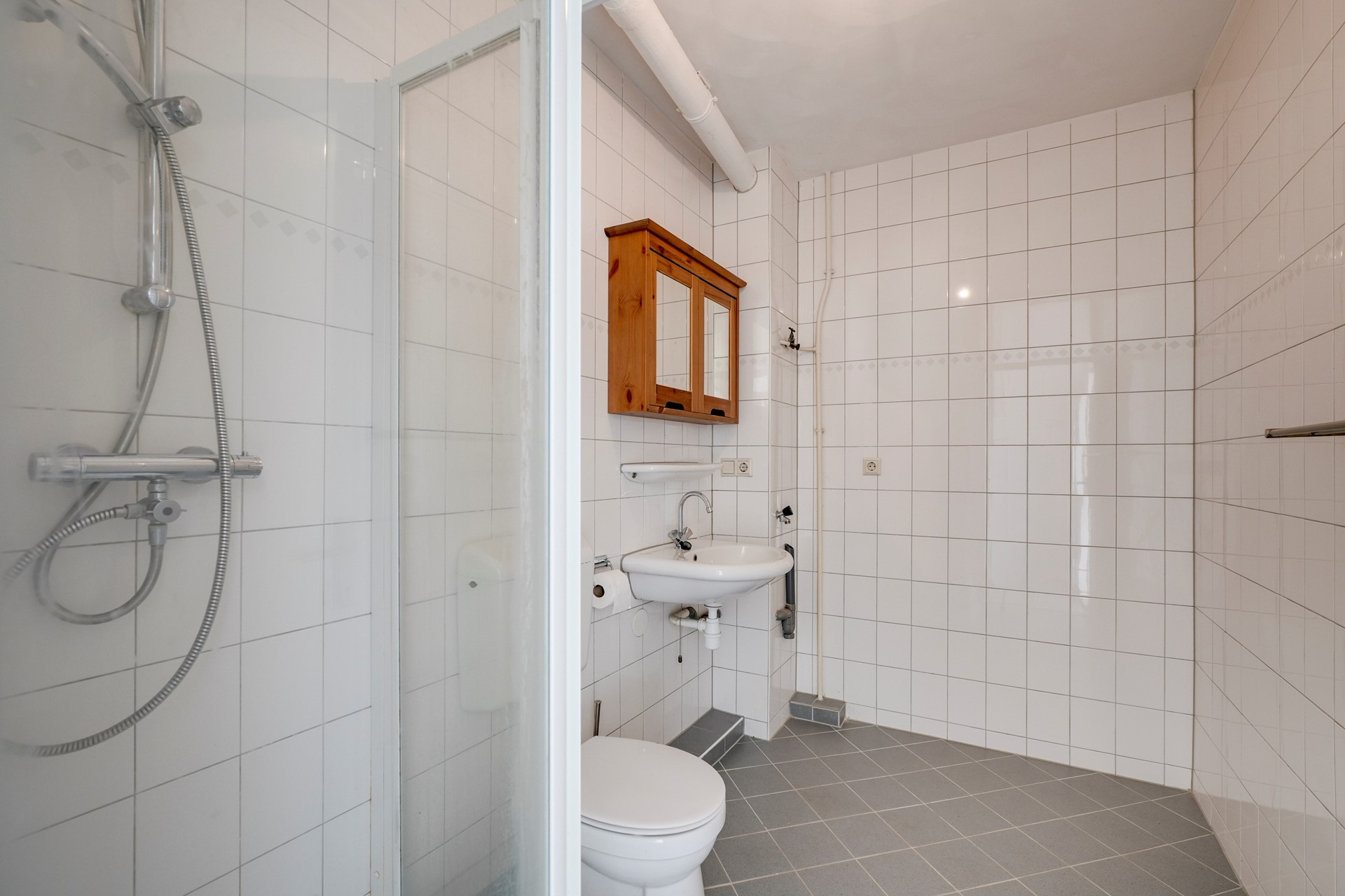 De badkamer is ruim opgezet en voorzien van een douche, toilet en wastafel. De ruimte biedt voldoende opties voor modernisatie.