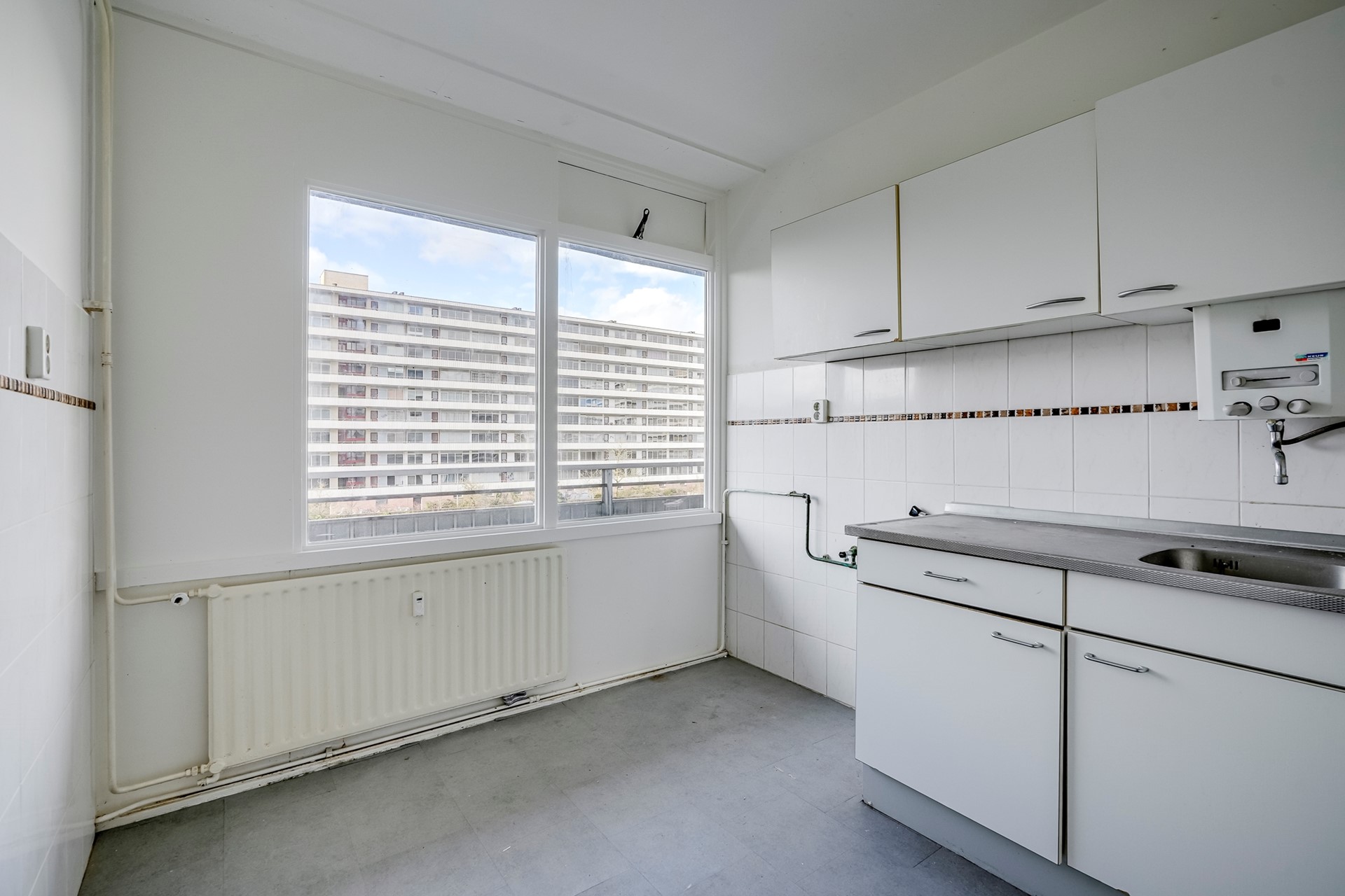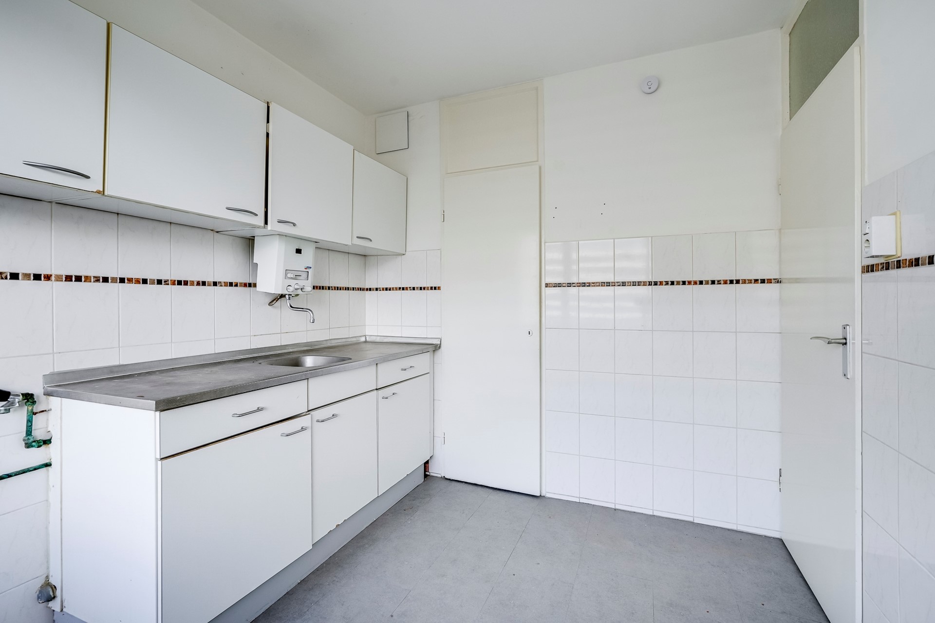 De keuken bevindt zich aan de voorzijde en is voorzien van een eenvoudig keukenblok. De ruimte biedt volop mogelijkheden om een moderne en royale keuken te realiseren die volledig aansluit op jouw woonwensen. Daarnaast is er een praktische bergkast met wasmachine aansluiting aanwezig.