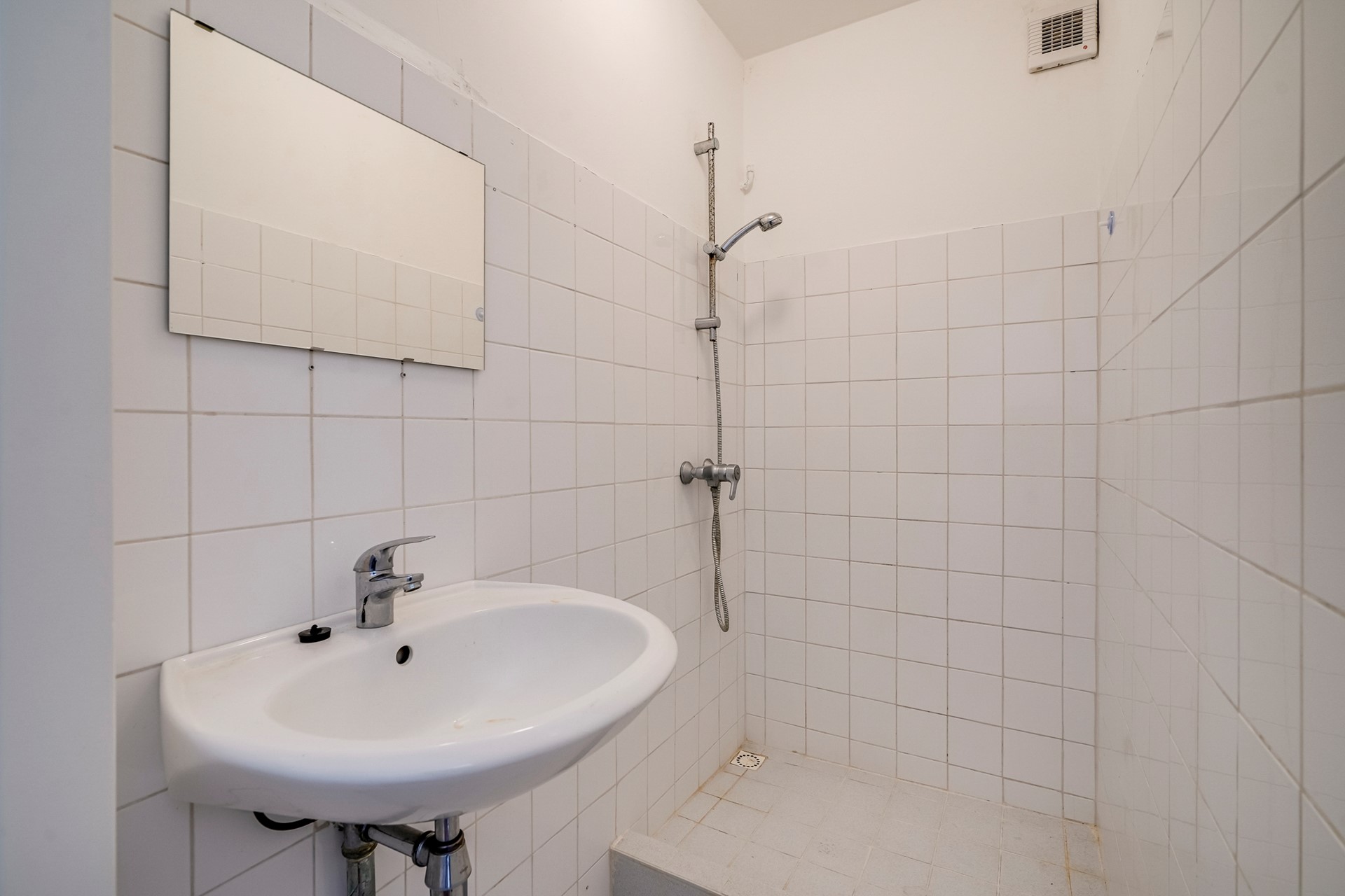 De badkamer beschikt over een inloopdouche en wastafel welke liefde of renovatie nodig hebben. Het toilet is separaat en tevens bereikbaar vanuit de hal.