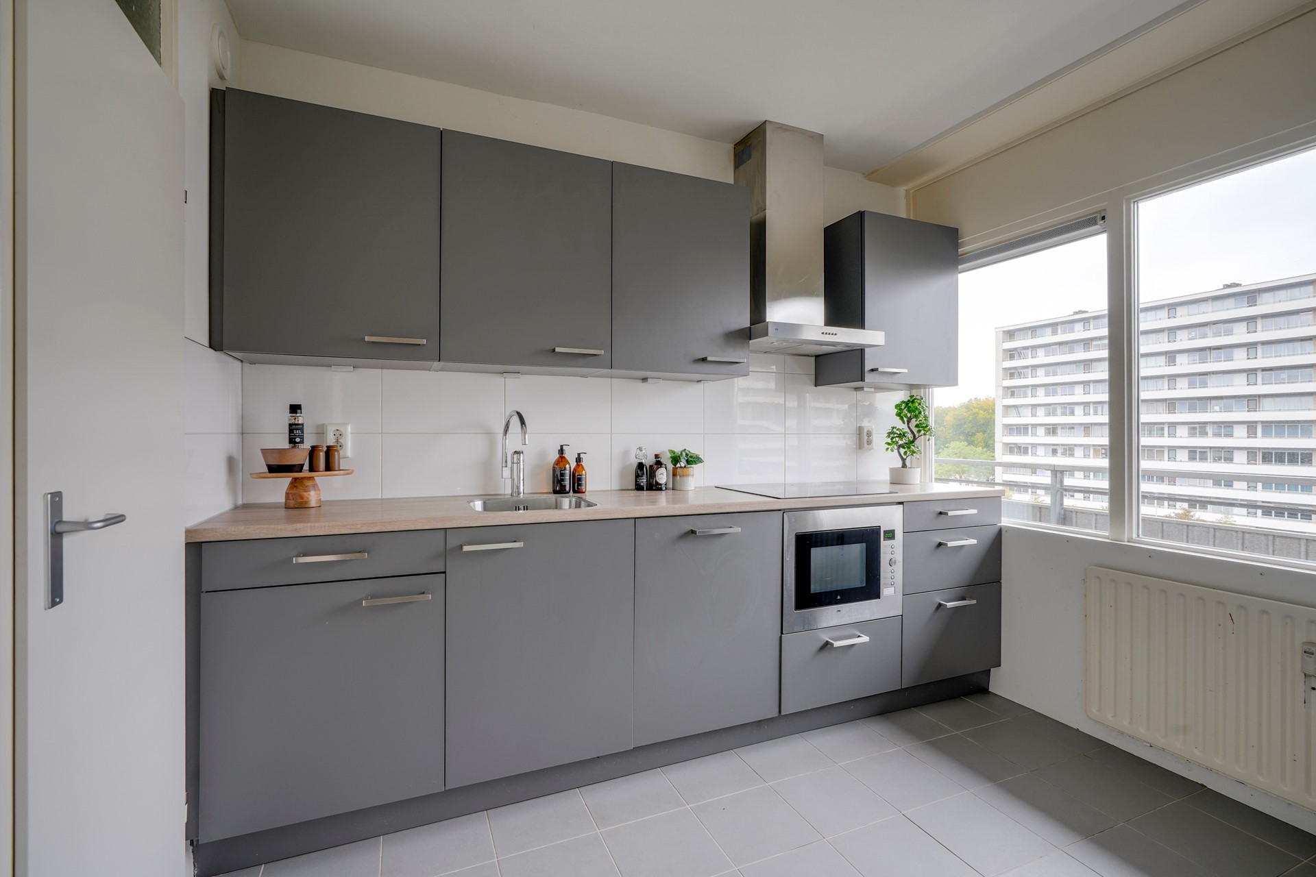 De keuken ligt aan de voorzijde en is volledig uitgerust met een elektrische kookplaat, afzuigkap, combi-oven/magnetron, vaatwasser, koelkast en vriezer. Daarnaast is er een praktische opbergkast/technische ruimte aanwezig. De lichte woonkamer aan de achterzijde biedt volop ruimte voor een gezellige zithoek en eethoek. Vanuit hier stap je het balkon op, gelegen op zuid-oost – een fijne plek om te genieten van de ochtend- en middagzon.