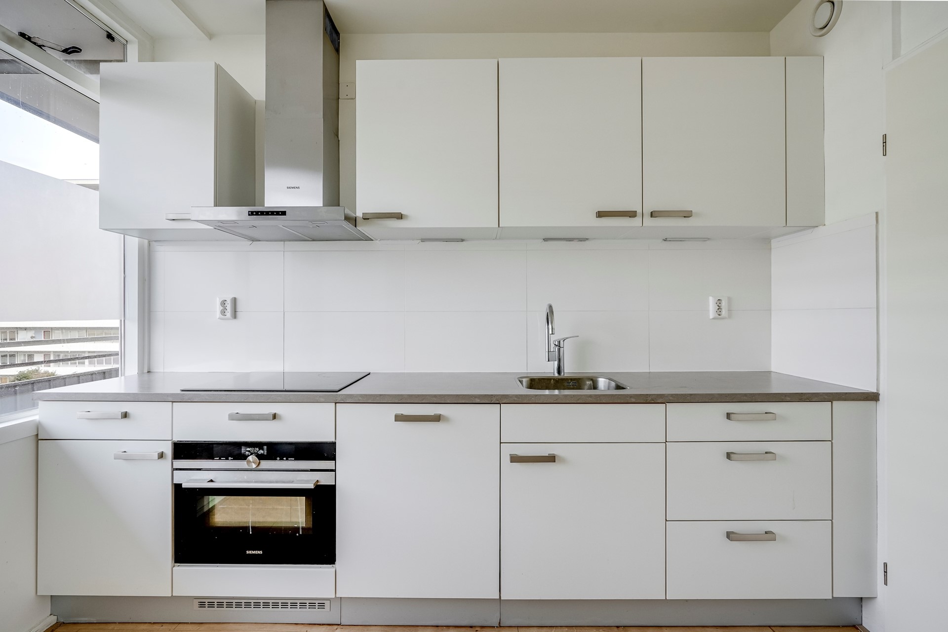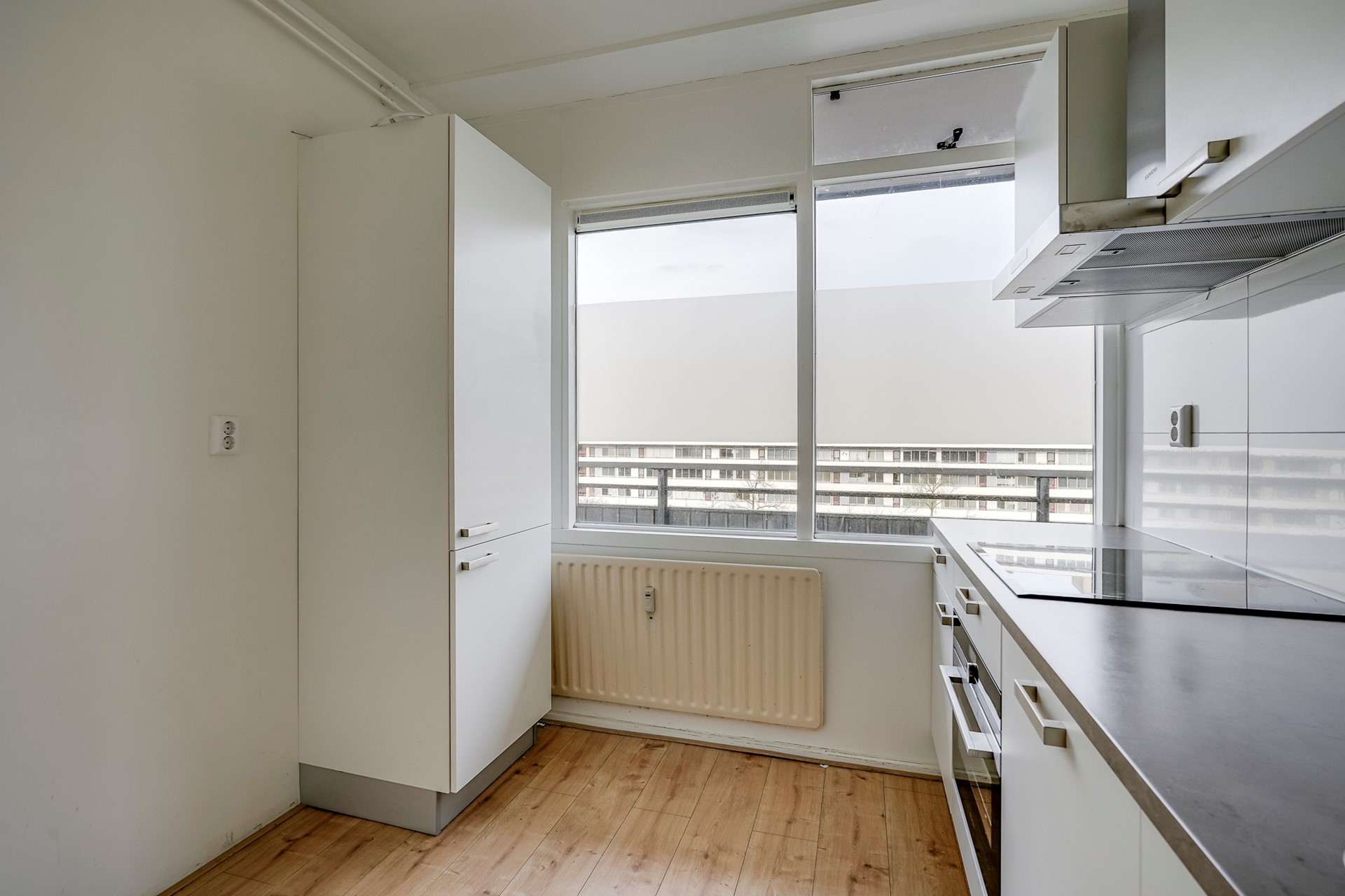 De keuken ligt aan de voorzijde en is volledig uitgerust met een elektrische kookplaat, afzuigkap, combi-oven/magnetron, vaatwasser, koelkast en vriezer. Daarnaast is er een praktische opbergkast/technische ruimte aanwezig. De lichte woonkamer aan de achterzijde biedt volop ruimte voor een gezellige zithoek en eethoek. Vanuit hier stap je het balkon op, gelegen op zuid-oost – een fijne plek om te genieten van de ochtend- en middagzon.