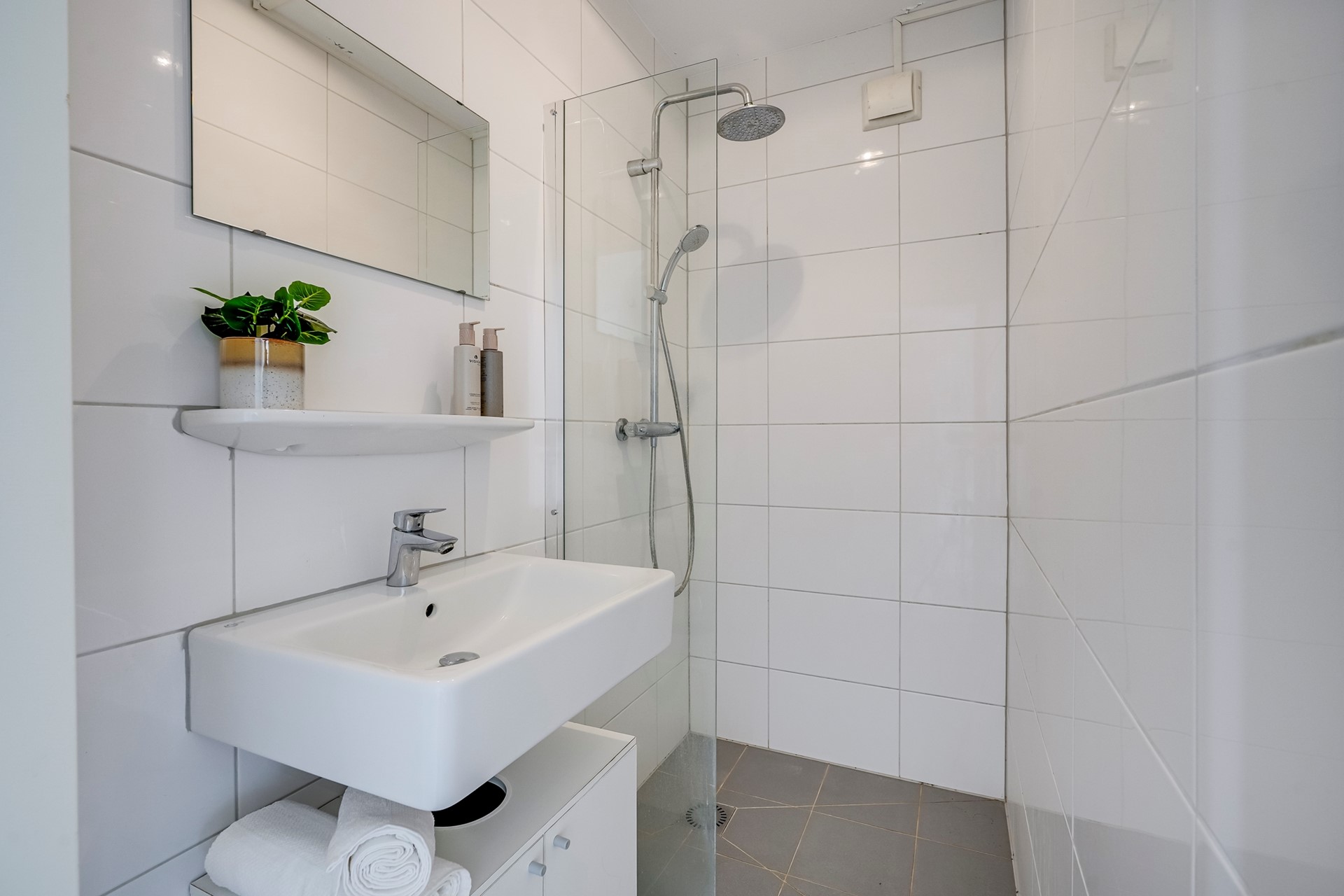 De badkamer ligt centraal in de woning en is voorzien van een inloopdouche en wastafel. Daarnaast is er een separaat toilet met fontein