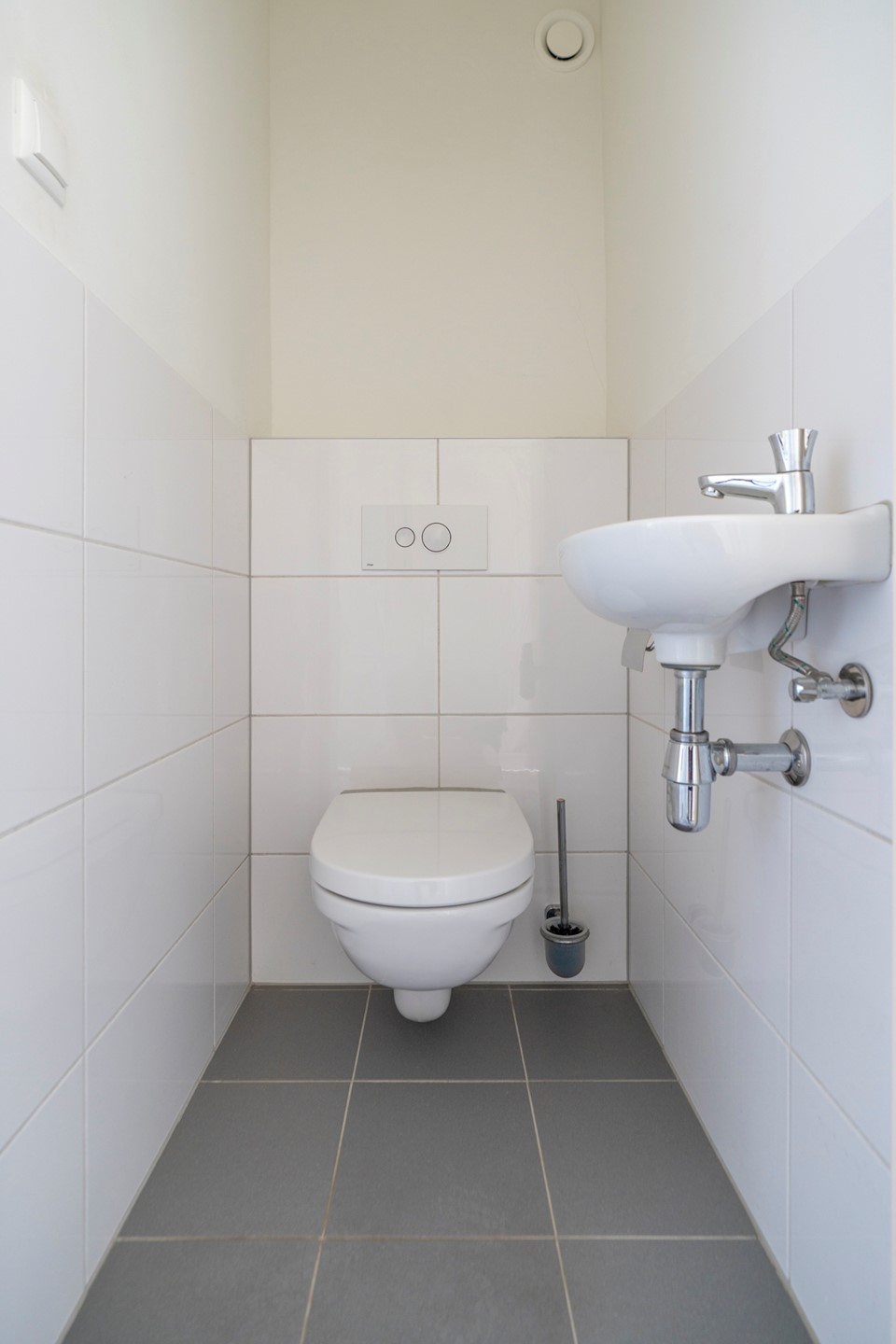 De badkamer is gelegen in het midden van de woning. Deze is modern en voorzien van een inloopdouche en wastafel. In de hal vind je tevens een separaat toilet met fontein.