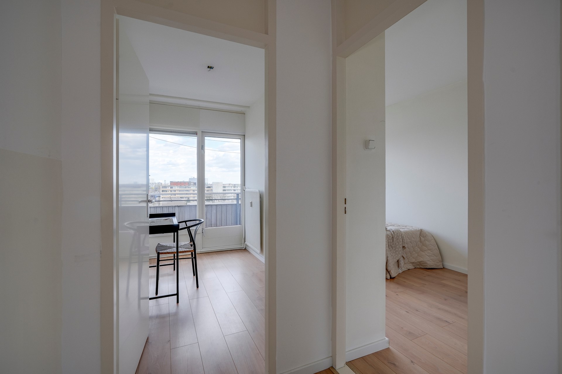 Het appartement beschikt over drie slaapkamers. Aan de achterzijde liggen twee kamers, waarvan één met directe toegang tot het balkon, ideaal als logeer- of werkkamer. De derde, ruime slaapkamer aan de voorzijde is perfect als master bedroom. De badkamer is netjes afgewerkt en voorzien van een inloopdouche en wastafel. Het toilet is separaat en bereikbaar vanuit de hal.