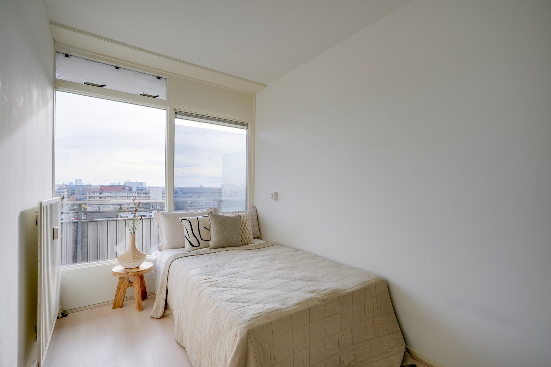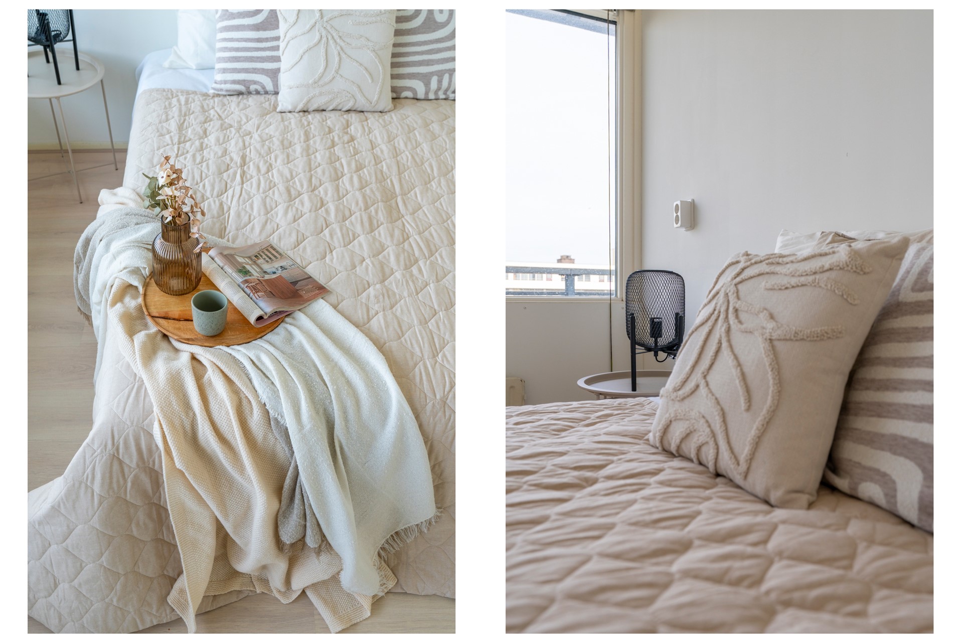 Het appartement beschikt over drie slaapkamers. Aan de achterzijde liggen twee kamers van prettig formaat, waarvan één met directe toegang tot het balkon: ideaal als werk- of logeerkamer. Aan de voorzijde bevindt zich de royale masterbedroom, met ruimte voor een groot bed en een kastenwand.