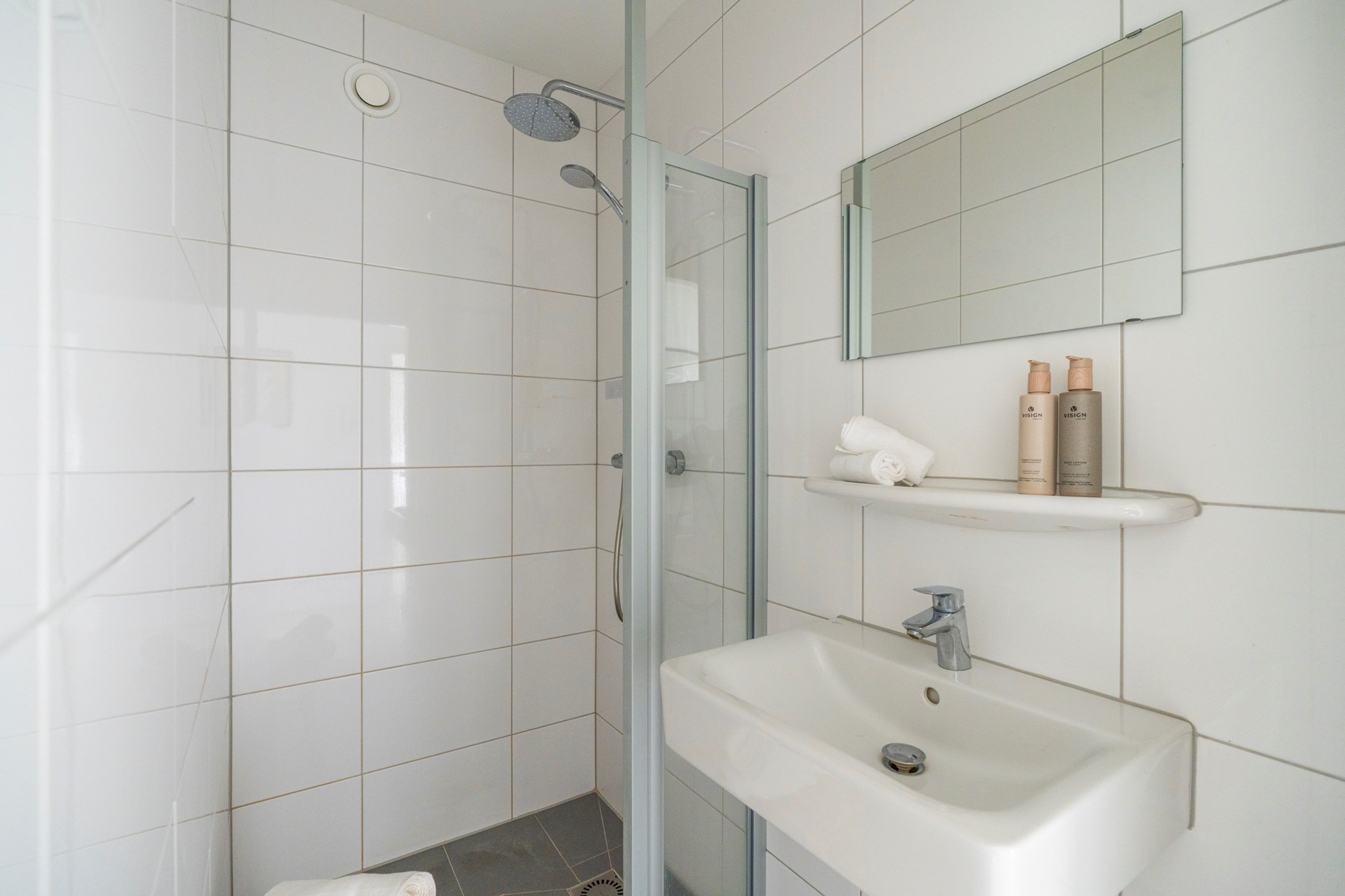 De badkamer ligt centraal in de woning en is voorzien van een inloopdouche en wastafel. Daarnaast is er een separaat toilet met fontein.